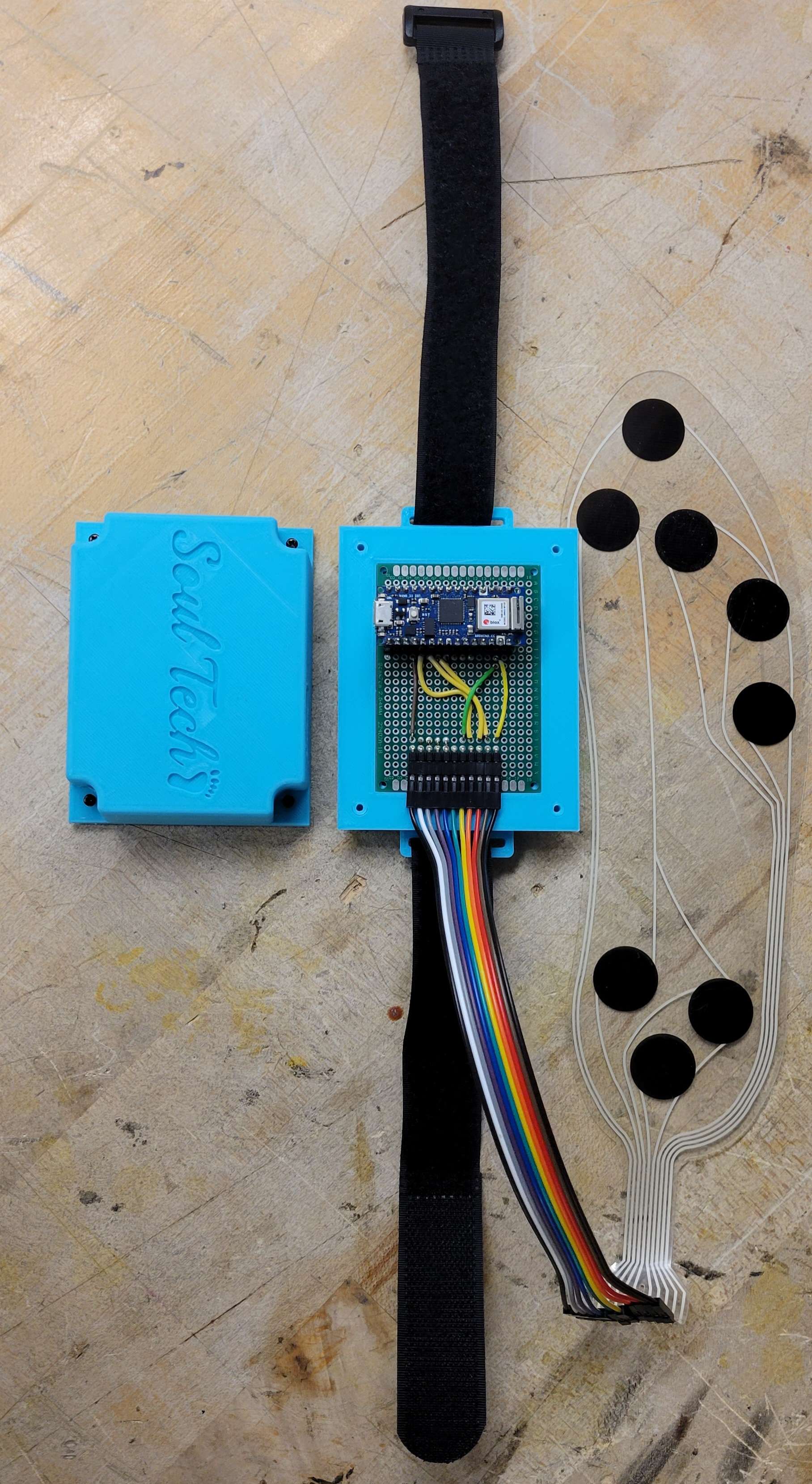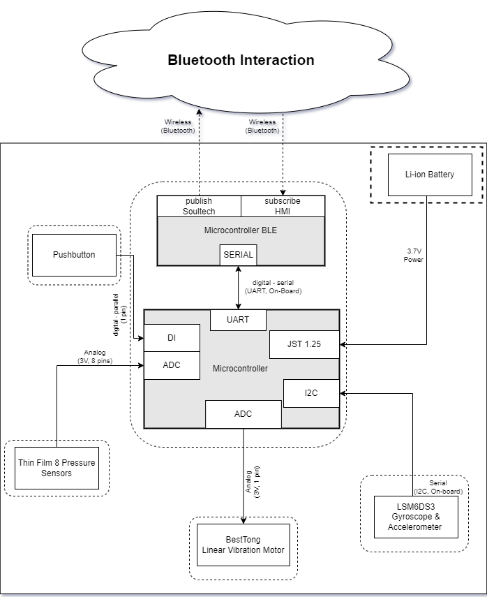 8 Analog Input pins are used to obtain the pressure readings. Additionally, an analog pin was used for the haptic feedback with a linear vibrator motor. An in-built IMU was incorporated into the system which enabled the team to obtain precise measurements of the orientation and movement of the device. Furthermore, to enhance the user experience and enable a more user-friendly interface, Bluetooth connectivity was also implemented. This allowed for seamless smartphone communication, enabling the user to monitor and control the device. The combination of the Arduino Nano 33 IoT, pressure sensor, haptic feedback vibrator motor, accelerometer, and Bluetooth connectivity enabled team SoulTech to build a highly efficient and user-friendly system for pressure measurement and gait analysis.