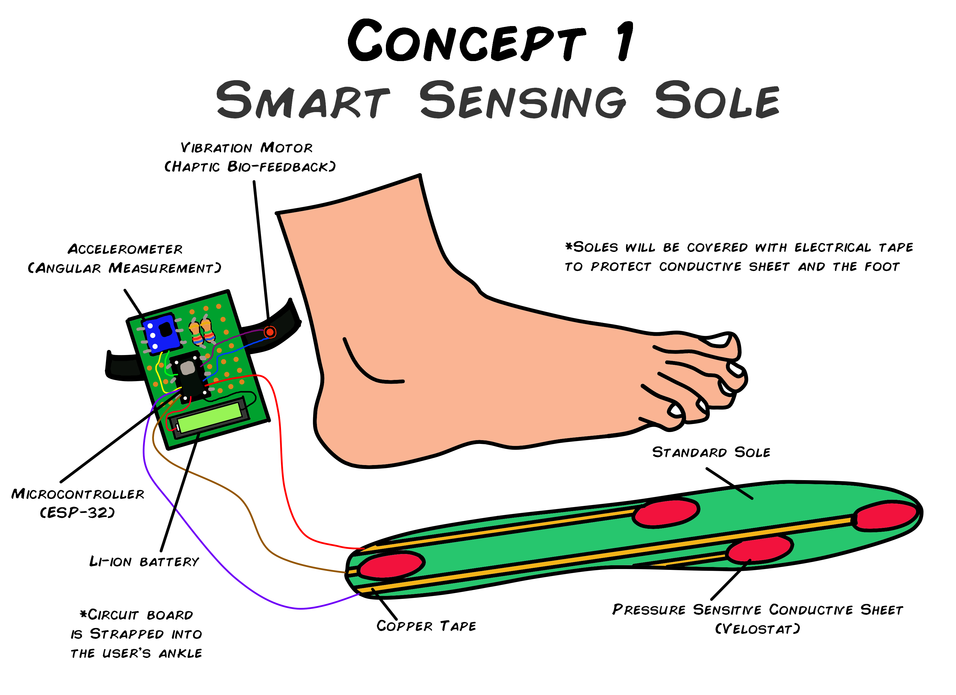 The sole mainly consists of a conductive sensing material such as a Velostat that will act as a pressure sensor. These will be connected to copper tape to transmit the analog signal generated from the sensed pressure to a wire connected to the microcontroller. The conductive sensing materials will be placed at specific points that the foot normally comes into contact with while walking. The soles will then be covered with electrical tape to protect the sensors as well as the user’s feet. The microcontroller will be placed in a separate housing with a daughterboard, vibrator, and accelerometer that will be strapped near the user’s ankle. The vibrator will be used for bio-feedback purposes.
