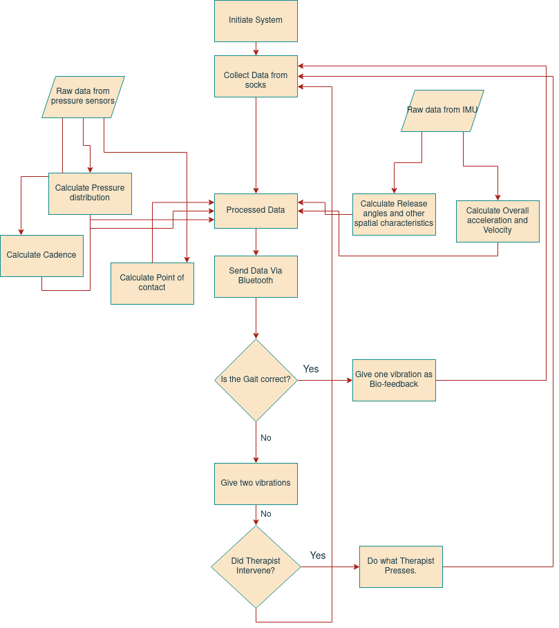 As the patient walks using the Gait Analysis sock, the doctors can analyze the pressure applied, time information, and spatial characteristics of the feet. Utilizing pressure sensors, the system records the pressure distribution, initial point of contact, and angle of the foot. By employing a complementary filter that combines pressure distribution and accelerometer data (modified with homogeneous transformation), the angle of the foot on the ground can be calculated while the sensor is attached to the ankle. The IMU data can further aid in determining spatial characteristics and cadence.